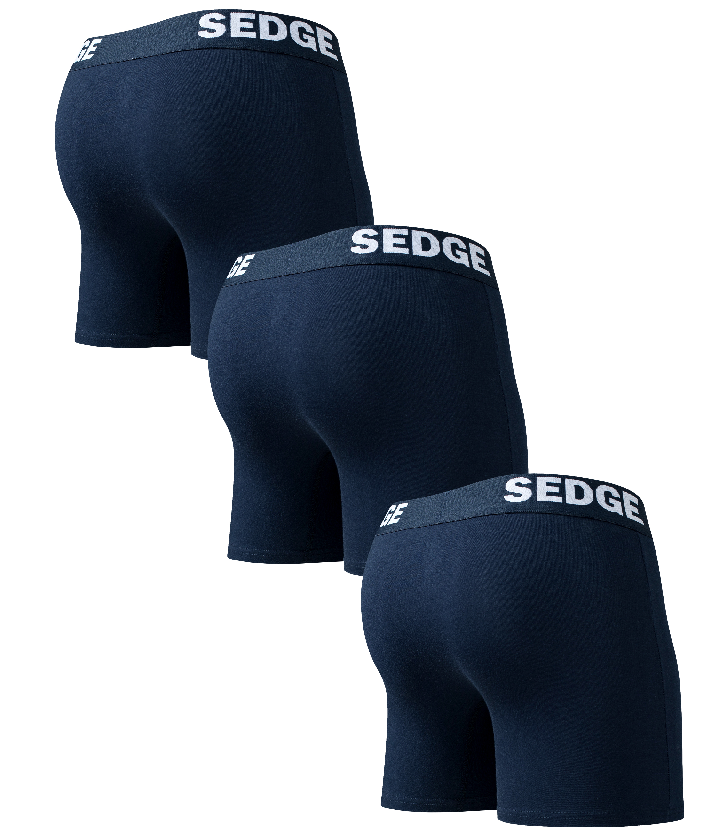 This is a pack of 3 blue Sedge boxer briefs. The elastic waistband is blue background with our logo emblazoned in white colour. We designed this pack for men that love elegance, comfort and blue underwear.